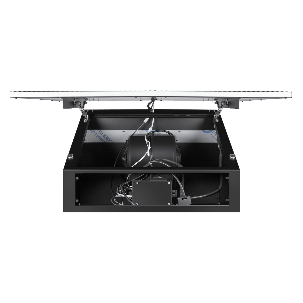 Вытяжка работает в режимах отвода и циркуляции, поэтому загрязнения удаляются из комнаты и перенаправляются в воздуховод, при этом можно очистить воздух и использовать повторно за счет возвращения его в помещение. Количество скоростей в этой модели: 4 шт. При этом максимальная производительность составляет 1270 куб.м./ч. Уровень шума при полной загруженности — 52 дБ.