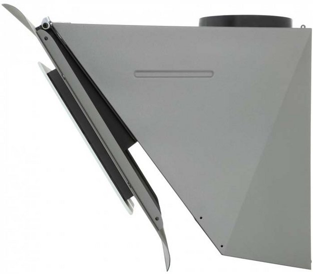 Наклонные модели — еще один вариант для небольшой кухни. Они размещаются на стене, но при высокой производительности не требуют много места. Их особенностью считается пониженный уровень шума и управление при помощи пульта ДУ. Эта категория вытяжек отличается большим разнообразием размеров, дизайна, цветов.