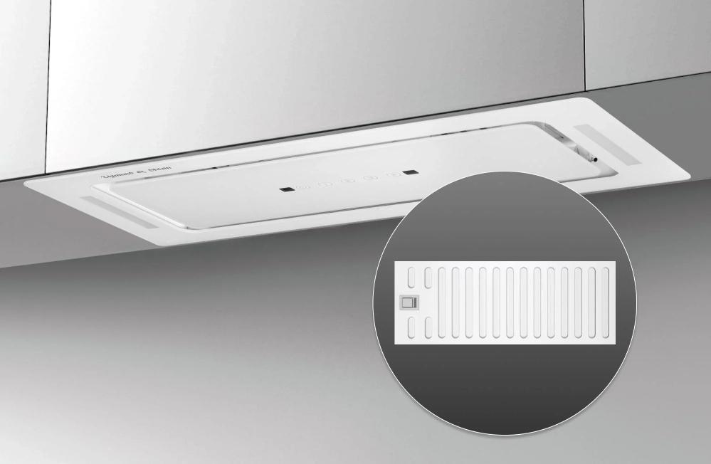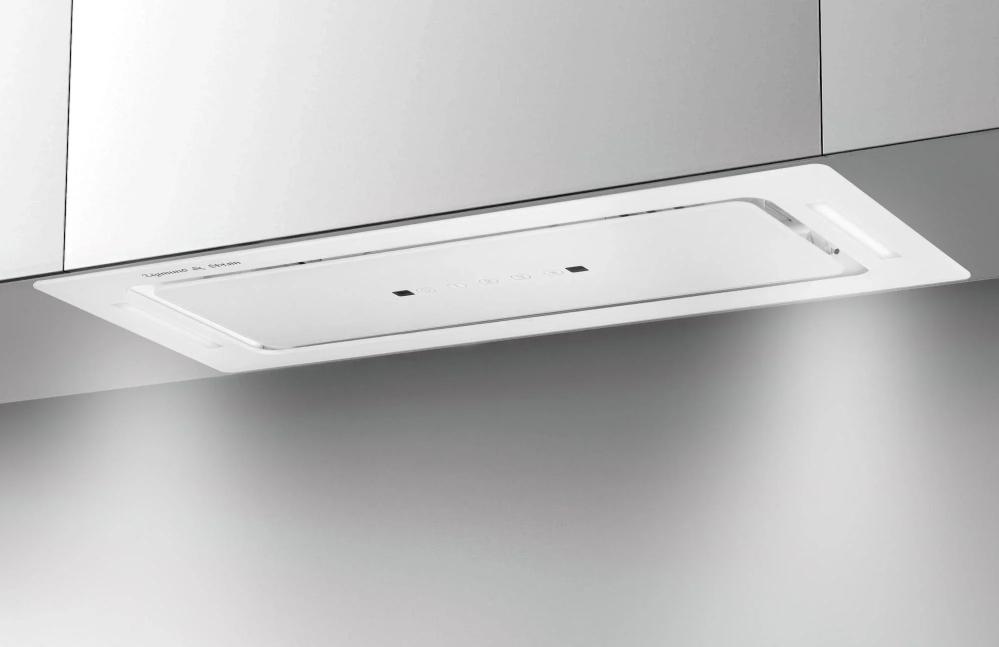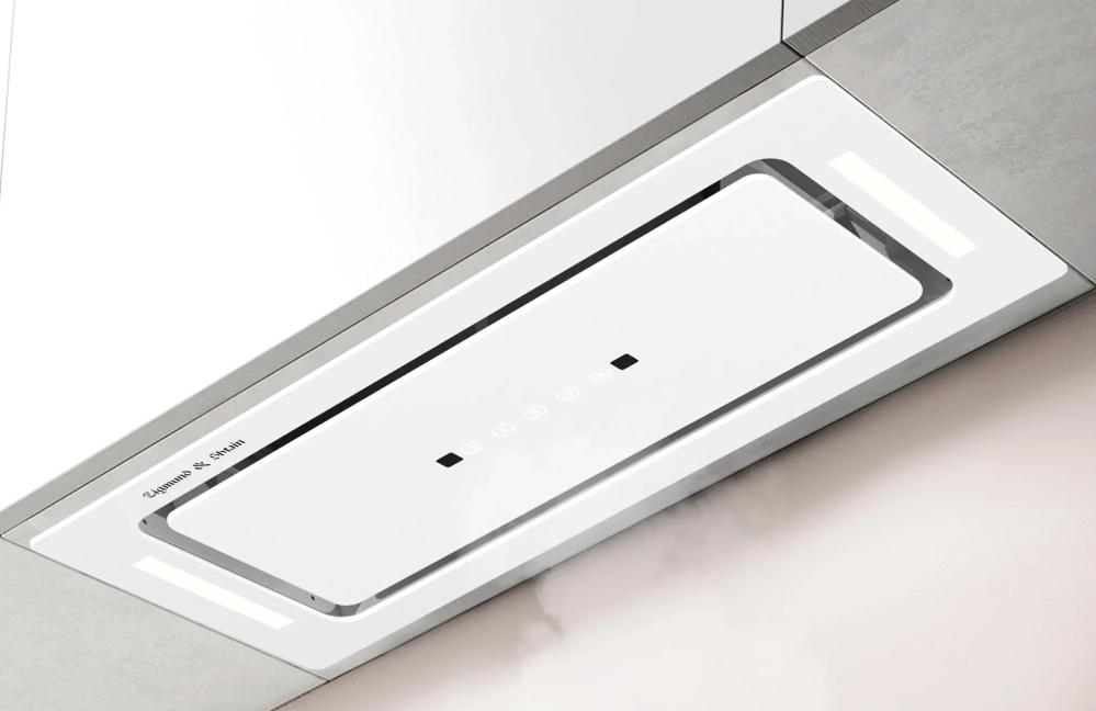 Вытяжка, встраиваемая в потолок, часто устанавливается над кухонным островом в просторной кухне и отличается достаточно высокой мощностью: она может работать как в режиме рециркуляции, так и в режиме отвода, так как воздуховод также скрыт в потолке. Вытяжки могут монтироваться в подвесной потолок либо устанавливаться в специальные многоярусные конструкции из гипсокартона непосредственно во время ремонта кухни. Для управления ими используется пульт ДУ.