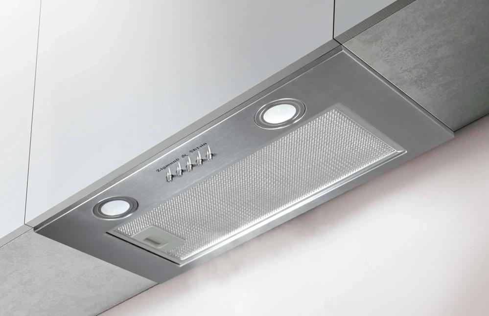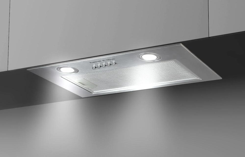 Встраивание вытяжки в шкаф — оптимальный вариант для малогабаритной кухни. Такие модели просты в установке, недороги, практически скрыты от глаз, их не нужно подбирать по внешнему виду, а также чем-то маскировать воздуховод. Уровень шума также снижается благодаря дополнительной звукоизоляции. Встроенные в шкаф модели могут дополняться выдвижной панелью, которая увеличивает площадь забора загрязненного воздуха. Иногда к встраиваемым относят также вытяжки, которые монтируются под подвесной шкаф, хотя их корпус остается на виду.