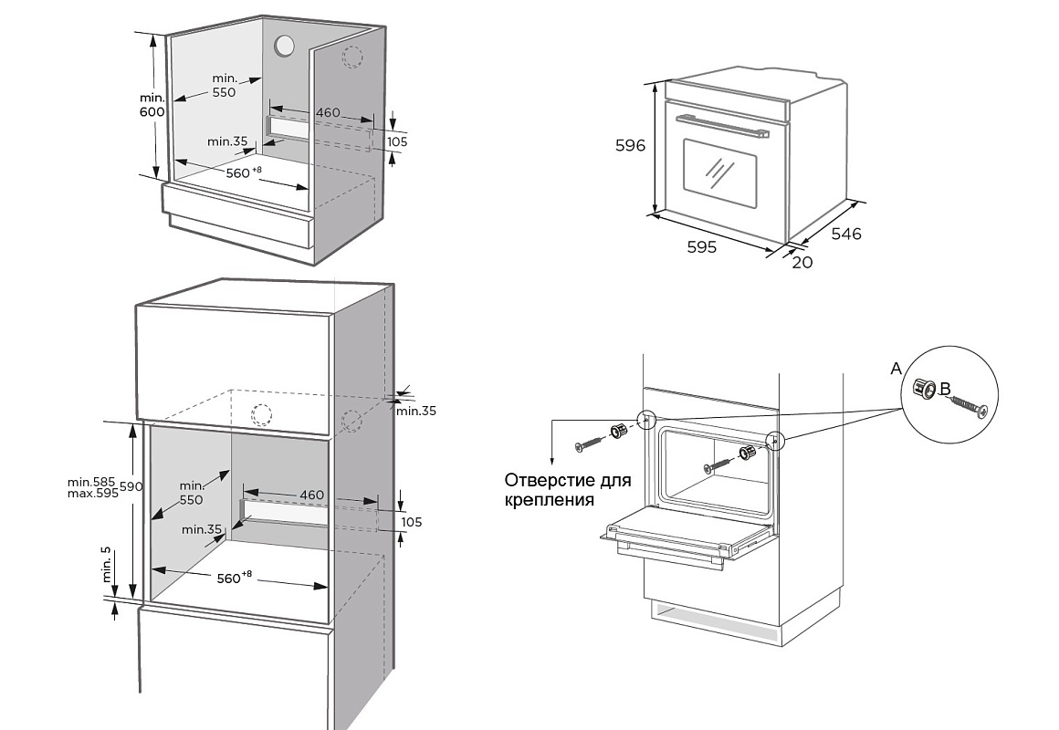 Korting OKB 1421 CN - схема встраивания с размерами к духовому шкафу на разных языках на Hausdorf