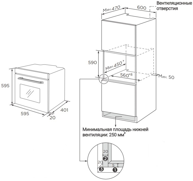 Midea MO47007GW - схема встраивания с размерами к духовому шкафу на разных языках на Hausdorf