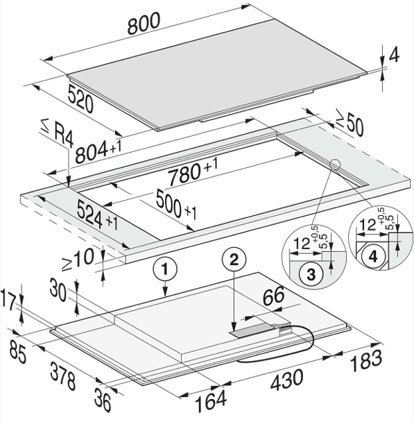 Miele KM 7474 FL 125 edition - схема встраивания с размерами к варочной панели на разных языках на Hausdorf