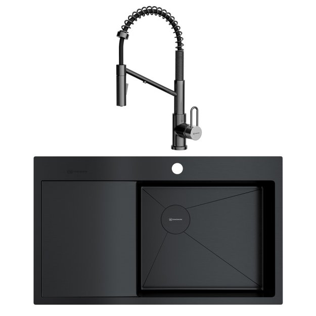 Внутри крана помещается шланг, который можно растянуть, чтобы достать струей воды до второй чаши мойки или тщательно сполоснуть посуду.