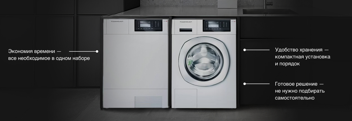 Стирально-сушильная колонна — современный вариант установки, который подходит для маленьких квартир или помещений со сложным дизайном, если нужно задекорировать бытовую технику. Модели бренда всегда согласуются друг с другом по дизайну.